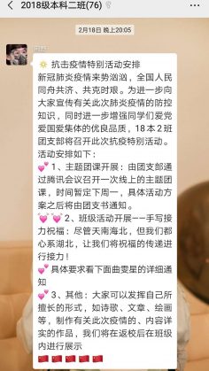 18本2班團(tuán)支委積極響應(yīng)這一倡議,在與張老師協(xié)商后,擬定開(kāi)展新冠肺炎疫情主題團(tuán)課及為武漢手寫(xiě)祝福兩項(xiàng)線上班級(jí)活動(dòng)。