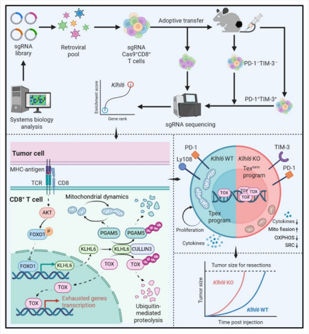 進一步機制解析發現,TOX和PGAM5是KLHL6的直接作用底物。在慢性感染或腫瘤微環境中,持續性TCR信號刺激引起KLHL6表達持續下調,進而削弱對TOX的泛素化降解,促使TOX蛋白積累,加速T細胞耗竭程序的啟動及向終末表型分化。同時,KLHL6表達下調還會通過PGAM5-Drp1信號軸誘導線粒體過度分裂和呼吸功能損傷,進一步加劇T細胞耗竭程度(見圖)。