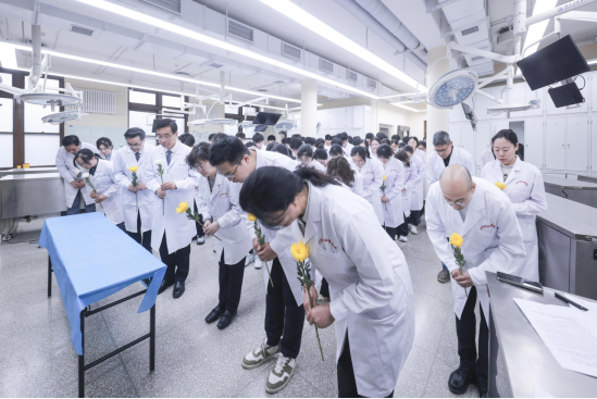 參加開課儀式的全體師生向我校首位遺體志愿捐獻(xiàn)者顧頡剛先生的骨骼、及所有大體老師三鞠躬并靜思,表達(dá)對(duì)逝者的深切緬懷與崇高敬意。