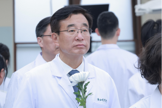院校長(zhǎng)王辰院士,院校黨委書記鄧海華,黨委副書記張勤,基礎(chǔ)學(xué)院黨委書記王婧,醫(yī)學(xué)教育研究中心主任歸航、副主任唐琳,兩位班主任、院校團(tuán)委書記尹嘉男和臨床學(xué)院外科學(xué)系馬琳,以及人體解剖與組胚學(xué)系全體老師和2022級(jí)八年制醫(yī)學(xué)專業(yè)全體同學(xué)參加開課儀式。教務(wù)處長(zhǎng)、人體解剖與組胚學(xué)系主任馬超主持儀式。在儀式的開始,老師們?yōu)橥瑢W(xué)們送上了象征醫(yī)學(xué)生身份的白大衣,這更是一份責(zé)任與使命的神圣寄托,激勵(lì)同學(xué)們朝著成為真正白衣天使的目標(biāo)努力。