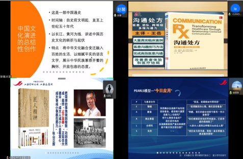 在首次云上讀書會上,4位學員以幻燈、音頻、視頻等作為輔助資料,依次分享了自己的讀書感悟,并就感興趣的觀點和實際工作中面臨的問題展開討論交流。趙馨分享了許倬云先生的著作《萬古江河》讀書心得,該書將中華文化融合變遷融入到對百姓生活的刻畫描寫,以細膩平時的語言文字,展示了中華民族兼容并蓄的胸懷和開放包容的態度。甄佳靜、姚雪寒結合《溝通處方》一書中的基本理論、現實案例、PEARLS模型和日常工作中遇到的溝通問題,分享了作為醫務工作者如何通過有效溝通,傳遞溫暖和人文關懷。任彥松分享了秋山立輝所著《匠人精神》一書中的主要觀點和以孝育人的成功實踐經驗。