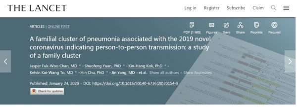 Chan, J., Yuan, S., et al. (2020). A familial cluster of pneumonia associated with the 2019 novel coronavirus indicating person-to-person transmission: a study of a family cluster. The Lancet.
