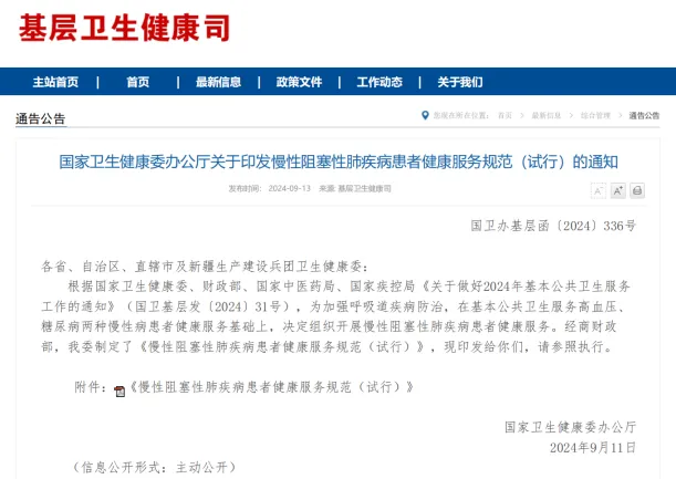 2024年9月13日,國(guó)家衛(wèi)生健康委、財(cái)政部、中醫(yī)藥局、國(guó)家疾控局聯(lián)合發(fā)布了《關(guān)于做好2024年基本公共衛(wèi)生服務(wù)工作的通知》,國(guó)家衛(wèi)生健康委辦公廳同時(shí)發(fā)布《慢性阻塞性肺疾病患者健康服務(wù)規(guī)范(試行)》,要求在基本公共衛(wèi)生服務(wù)中增加慢阻肺病患者健康服務(wù)。這是繼7月份國(guó)家衛(wèi)生健康委等13個(gè)部門(mén)聯(lián)合制定《健康中國(guó)行動(dòng)——慢性呼吸系統(tǒng)疾病防治行動(dòng)實(shí)施方案(2024-2030年)》后,加強(qiáng)慢性呼吸疾病防治的又一重要舉措。