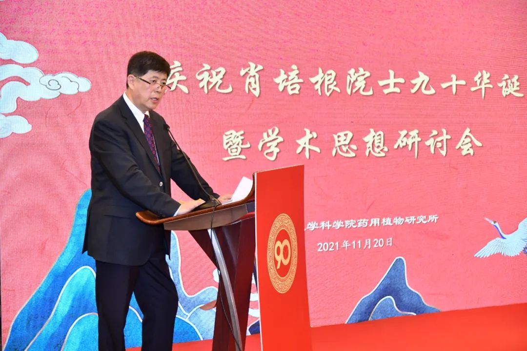 黃璐琦院士、王國辰秘書長、藥用植物研究所黨委書記范曉明先后致辭,表達對肖培根院士的崇高敬意和熱烈祝賀。藥用植物研究所所長孫曉波以《匯通古今,踏遍青山建偉業;學貫中西,縱橫五洲創未來》為題,系統回顧了肖培根院士創立藥用植物親緣學、開創藥用植物三級開發戰略理論等方面的學術思想和開創性成就,并號召藥植所師生職工弘揚和傳承老一輩科學家熱愛黨,熱愛祖國的崇高理想和信念,學習他們的精勤不倦,勇于創新的治學精神,不忘初心再圖強、實事求是促發展,在建設藥用植物科技創新體系核心基地征程中創造新的輝煌。
