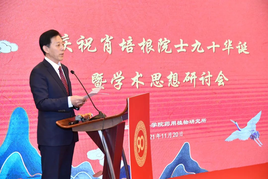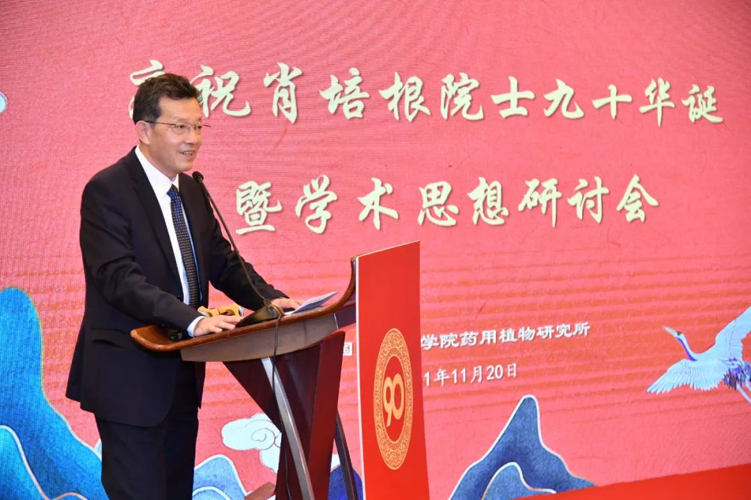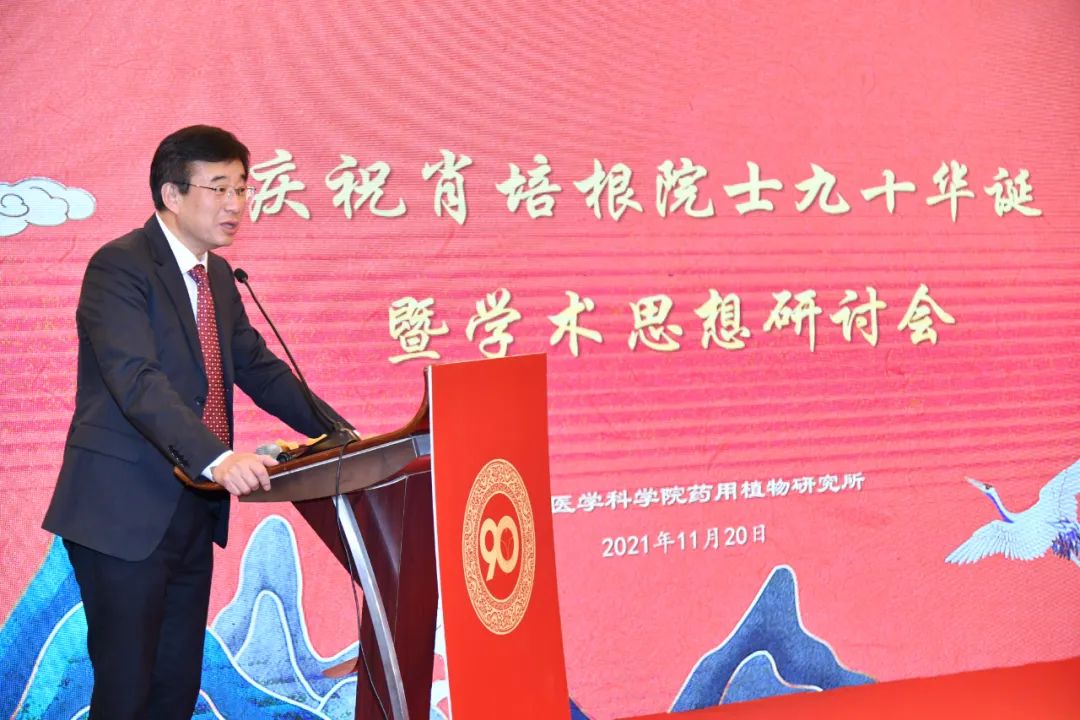 中國醫學科學院北京協和醫學院院校長王辰院士、黨委書記姚建紅、副院校長李青等院校領導,國家中醫藥管理局副局長、中國中醫科學院院長黃璐琦院士,陳可冀、劉昌孝、俞夢孫、陳君石、甄永蘇、蔣建東、肖偉等院士,中華中醫藥學會副會長兼秘書長王國辰教授,來自中國醫學科學院、中國中醫科學院等直屬所院,中國中藥有限公司等合作單位的領導和嘉賓,以及藥用植物研究所黨政領導、師生代表等50余人歡聚一堂,暢談肖培根院士的學術思想及其在立德樹人、報國為民等方面所做的貢獻,共賀肖培根院士九十華誕。