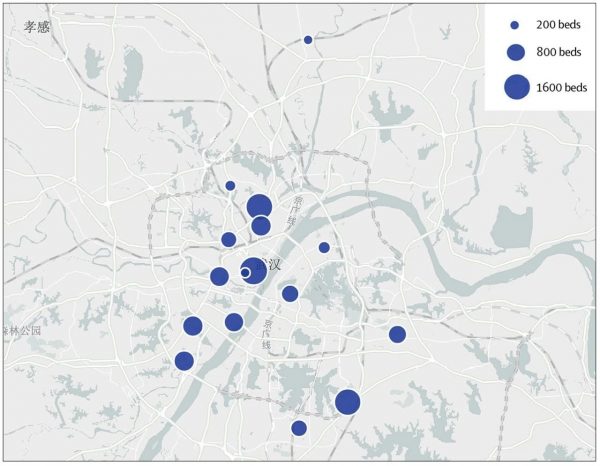 圖4: 中國武漢市暴發新冠肺炎疫情期間,方艙庇護醫院的位置和容量(圓的大小與相應方艙庇護醫院的病床數量成正比)