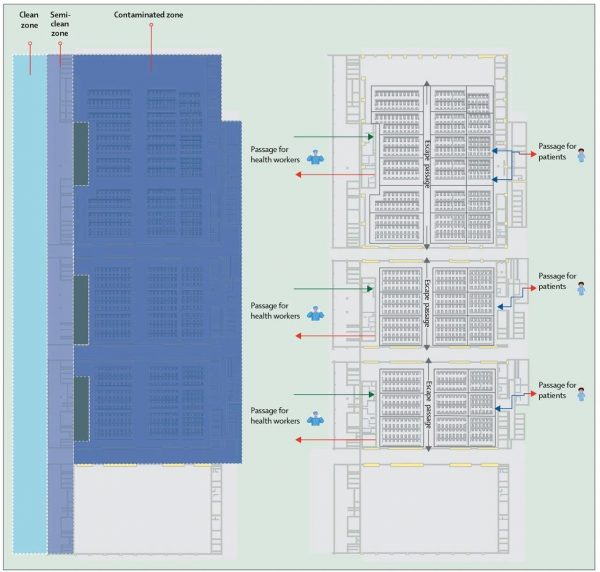 圖2:中國武漢一家由會展中心改建的方艙庇護醫院的區域和通道設置