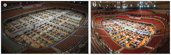 圖5:中國武漢市暴發新冠肺炎疫情期間,一家由體育館改造成的方艙庇護醫院 (左圖為收治患者前,右圖為收治患者后情況)