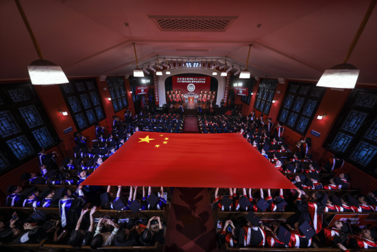 典禮開始,下一屆優秀學生代表手捧金箍環繞的文海牌,引領23位“校長獎”獲得者,從九號院步入壹號禮堂,再現協和百年經典場景。學生代表領唱歌曲《我愛你中國》,協和愛樂樂團演奏管弦樂,就此拉開典禮的序幕。巨幅五星紅旗徐徐展開,畢業生們高舉雙手,深情撫觸掠過頭頂的國旗,鮮紅的旗面波瀾起伏,對祖國的熱愛油然而生。“撫旗儀式”后,全體起立,奏唱國歌。