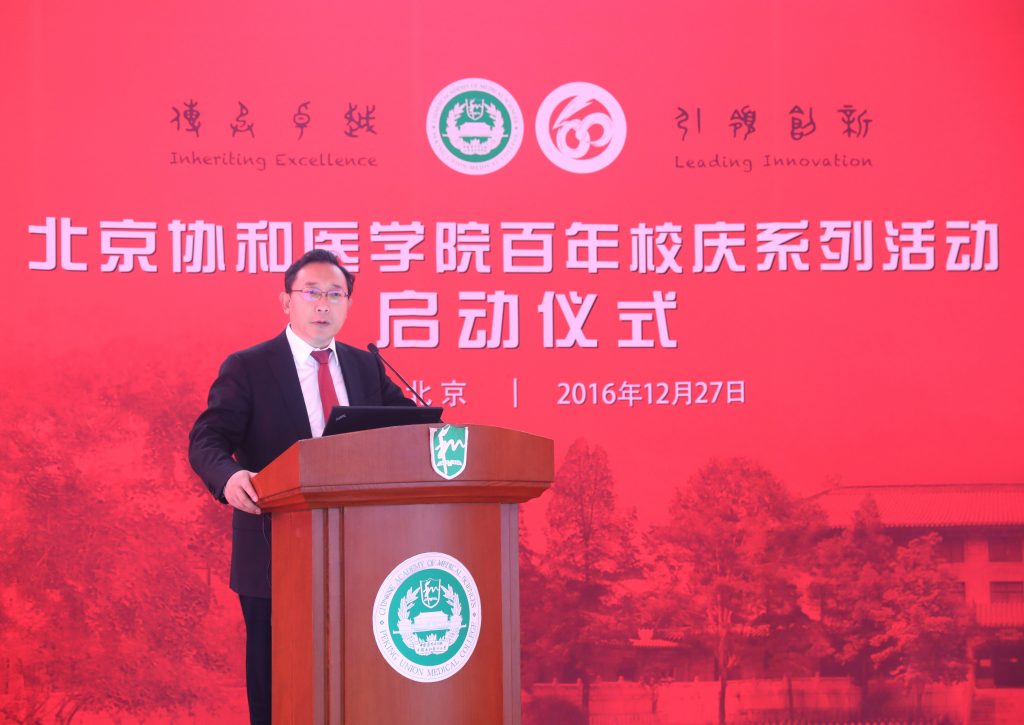隨后,曹雪濤院校長(zhǎng)為本次儀式致辭。他首先對(duì)北京協(xié)和醫(yī)學(xué)院發(fā)展的歷程和取得的成就進(jìn)行了回顧。曹雪濤院校長(zhǎng)指出,一百年來(lái),創(chuàng)建于1917年的北京協(xié)和醫(yī)學(xué)院是中國(guó)現(xiàn)代醫(yī)學(xué)教育的搖籃,開(kāi)創(chuàng)了我國(guó)八年制臨床醫(yī)學(xué)教育先河,確立了醫(yī)預(yù)科、八年長(zhǎng)學(xué)制和住院醫(yī)師等的醫(yī)學(xué)生培養(yǎng)制度,創(chuàng)建了現(xiàn)代中國(guó)護(hù)理教育和藥學(xué)專業(yè),在世界上首創(chuàng)定縣公共衛(wèi)生模式,成功開(kāi)拓現(xiàn)代公共衛(wèi)生教育,對(duì)中國(guó)醫(yī)學(xué)醫(yī)教研一體化發(fā)展以及藥學(xué)、預(yù)防醫(yī)學(xué)、公共衛(wèi)生等健康事業(yè)發(fā)展起到了決定性作用。