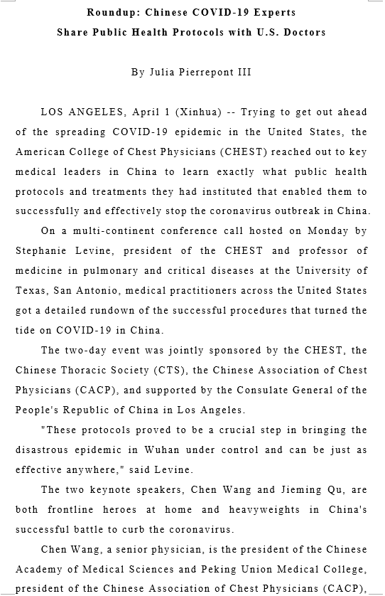 編者的話 3月30日,美國胸腔醫師學會(CHEST)、中國呼吸學會、中國呼吸醫師協會和中國駐洛杉磯總領事館共同舉辦了2場“中美攜手抗擊新冠:中國高級別專家向美國同行分享最前線經驗”網絡研討會,研討會由美國胸腔醫師學會主席StephanieLevine教授主持,中國醫學科學院院長王辰院士、上海瑞金醫院院長瞿介明、中日友好醫院副院長曹彬、中日友好醫院呼吸與危重癥醫學科主任詹慶元等中國頂尖專家向美國醫護人員分享了中國抗擊新冠肺炎的成功經驗,引起中美兩國醫學界和媒體廣泛關注。