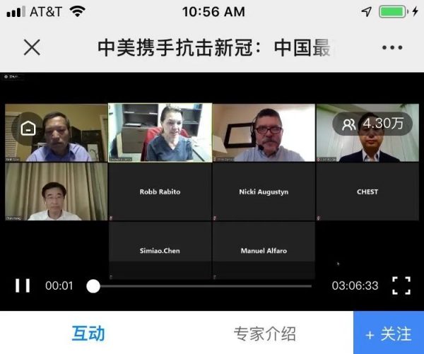 國內派出了醫療界最權威的四位講者,包括中國醫學科學院院長王辰教授,上海瑞金醫院的瞿介明教授,中日友好醫院的曹彬和詹慶元教授。這幾位都是有關專業學會的主要負責人,而且都是帶著在武漢前線親臨一線的幾個月的實戰經驗,美國這邊也是學會主席與董事長親自主持坐鎮。不僅如此,中華人民共和國駐洛杉磯的總領事張平大使也親自致辭。