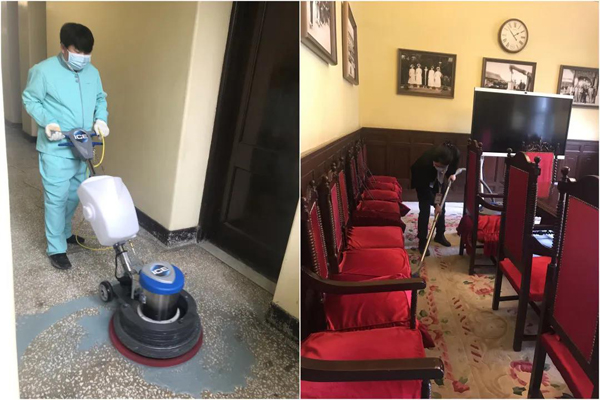 工作人員全程佩戴口罩,按照任務單分區劃片,對庭院、樓道、會議室、衛生間等場所進行全方位的清潔、消毒,對門窗、樓體扶手等部位細心擦拭。物業公司管理員不間斷巡查各個區域,關鍵部位清潔時全程緊盯,反復叮囑工作人員注意保護文物和安全作業。