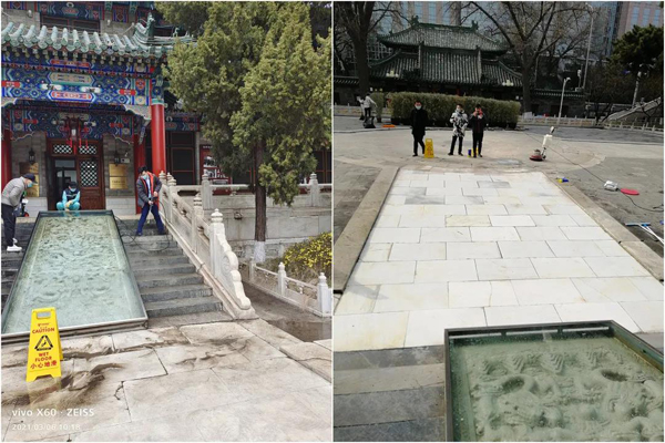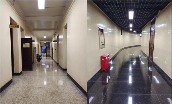 經過兩天的辛勤勞動,庭院廣場、臺階、丹陛、白玉欄桿洗去浮塵,芳華再現;樓內走廊、樓梯扶手、地面漬痕盡去,煥然如新;會議室墻裙、地毯清潔如洗,窗明幾凈……