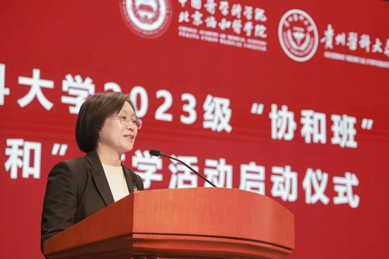 齊曉嵐副校長在致辭中向為本次研學活動付出辛勤努力的院校各位領導老師表示最衷心的感謝和最崇高的敬意。她指出,“協和班”是推動中西部高校綜合實力提升、促進貴州省高等教育服務地方經濟社會高質量發展工作最顯性的體現,也是工作開展最有力的抓手?!皡f和班”至今已連續招生6屆,為貴州培養卓越臨床醫學及醫學科學人才做出了重要貢獻,十分感謝院校一直以來對貴州醫科大學的大力支持和幫助指導。齊曉嵐副校長親切寄語2023級“協和班”學生,希望大家以宗恩先生為楷模,立下以醫報國之志;保持嚴謹求實的科學態度,踐行嚴謹求實之風;保持對醫學的熱愛和好奇心,弘揚開拓創新之魂,不斷探索和創新,勇攀科研和臨床的高峰。