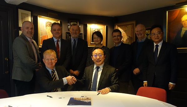 曹雪濤院校長與牛津大學醫學部副主任Richard Cornall教授簽署新的合作諒解備忘錄(后排左一為Nuffield醫學院副院長Darren Nash先生、左二為維康信托基金理事長Jeremy Farrar博士,左三為Nuffield醫學院院長Chris Colon教授,右三為MRC免疫學中心主任Enzo Cerundolo教授,右二為英國皇家學會會員Andrew McMichael爵士)