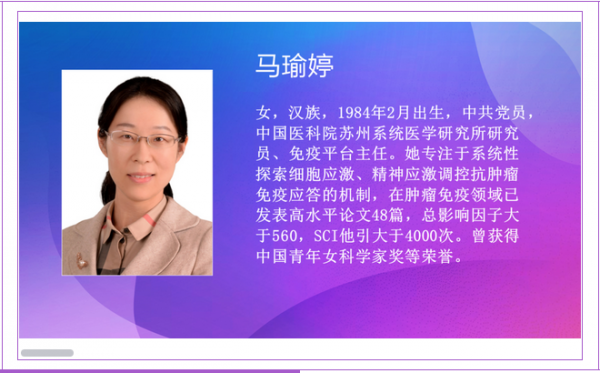 馬瑜婷研究員在入職的5年時間里,帶領(lǐng)科研團隊開創(chuàng)性地探索了“精神應激”對抗腫瘤免疫應答的調(diào)控機制,建立了完備的腫瘤免疫學、神經(jīng)內(nèi)分泌學、行為學、細胞生物學及生物信息學研究平臺,實現(xiàn)了實驗流程及數(shù)據(jù)分析的標準化。她積極承擔國家及省部級多項重點/重要科研項目,已在Science、Nat Med、Immunity等國際高水平雜志發(fā)表48篇論文,總影響因子>560,SCI他引4000余次。