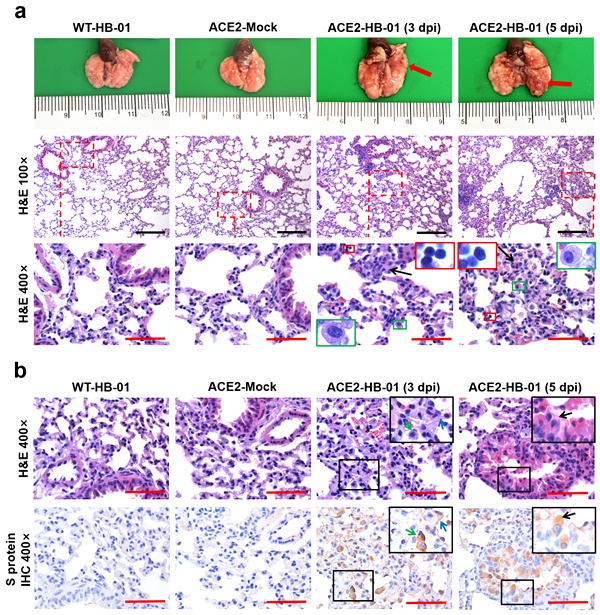 血管緊張素轉(zhuǎn)換酶2(ACE2)是SARS-CoV感染細(xì)胞的受體,病毒S蛋白的RBD區(qū)域通過與ACE2結(jié)合而進(jìn)入細(xì)胞內(nèi),該團(tuán)隊(duì)曾在非典期間用ACE2人源化的轉(zhuǎn)基因小鼠研制了SARS-CoV感染小鼠模型。SARS-CoV S蛋白和SARS-CoV-2 S蛋白具有大約76%的氨基酸序列一致性,生物學(xué)分析推測ACE2同為SARS-CoV-2的細(xì)胞受體,但尚缺乏確鑿的證據(jù)。該團(tuán)隊(duì)選擇了ACE2人源化的轉(zhuǎn)基因小鼠,研究了SARS-CoV-2的致病性,感染SARS-CoV-2的hACE2轉(zhuǎn)基因小鼠出現(xiàn)體重減輕等癥狀,病毒主要在小鼠肺部復(fù)制。典型的組織病理學(xué)表現(xiàn)為間質(zhì)性肺炎,肺泡間質(zhì)有明顯的巨噬細(xì)胞和淋巴細(xì)胞浸潤,肺泡腔內(nèi)有巨噬細(xì)胞聚集。病毒抗原可見于支氣管上皮細(xì)胞、巨噬細(xì)胞和肺泡上皮細(xì)胞。