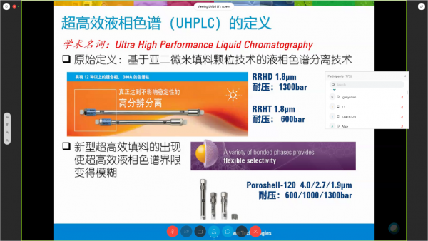 本次技術講堂采用線上授課模式,是為響應政府號召,積極應對疫情采取的特別教學手段,是現代技術培訓與課堂教學深度融合的改革需要,是在師生共同努力下實現的。課程共分8個板塊,由分析測試中心左利民老師擔任課堂主持人,內容涉及色譜分析方法開發、質譜技術解析應用及代謝組學研究全流程分析等多個領域。從藥物分析常用設備基本原理到最新的應用前沿,各協辦單位施展所長,聘請最資深的技術專家在線進行授課,參與人數近200人,互動效果良好,相隔遙遠卻仿佛近在眼前,同學們求知若渴的熱情和老師們授業解惑的認真態度完美融合。