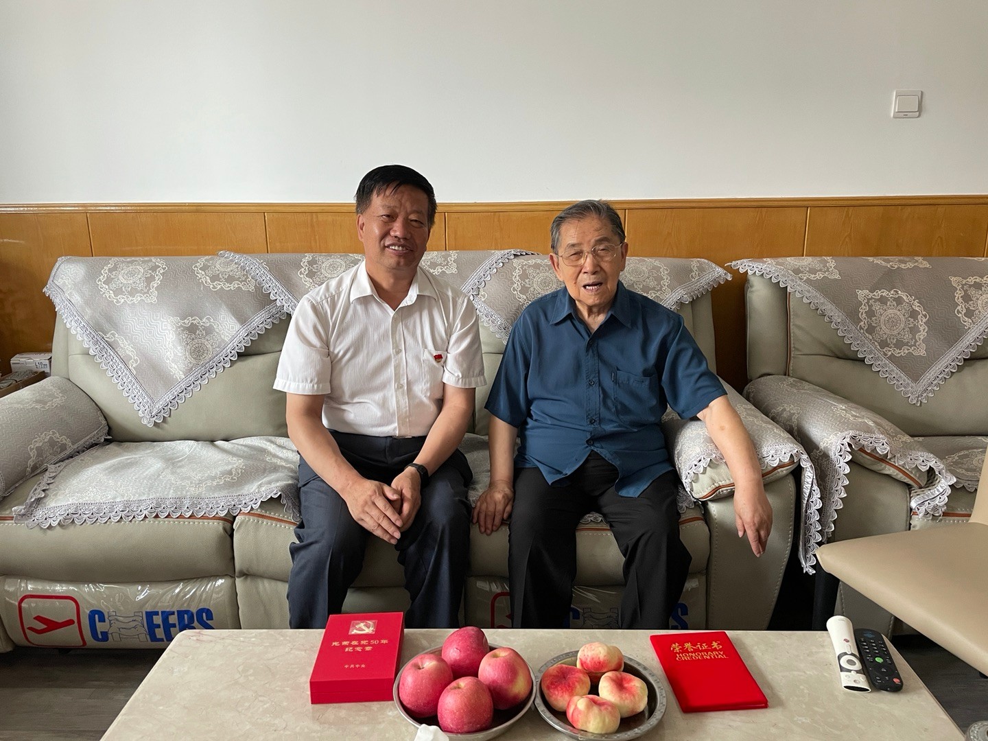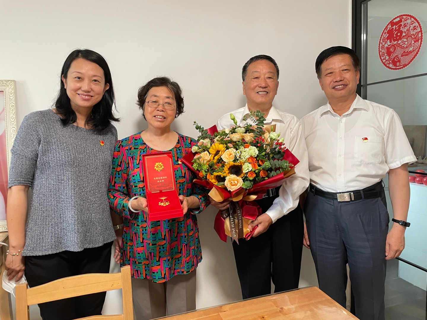 在慶祝中國(guó)共產(chǎn)黨成立100周年之際,為了傳遞黨的溫暖,進(jìn)一步增強(qiáng)老黨員的榮譽(yù)感、歸屬感和使命感,弘揚(yáng)老一輩共產(chǎn)黨員英勇頑強(qiáng)甘于奉獻(xiàn)的革命精神,6月25日,護(hù)理學(xué)院黨委副書(shū)記安道彩同志帶領(lǐng)黨政辦公室主任和退休黨支部書(shū)記,前往老黨員家中開(kāi)展走訪慰問(wèn),并向他們及離世老黨員家屬送去“光榮在黨50年”紀(jì)念章,送去學(xué)院黨委和廣大師生的誠(chéng)摯問(wèn)候和崇高敬意。
