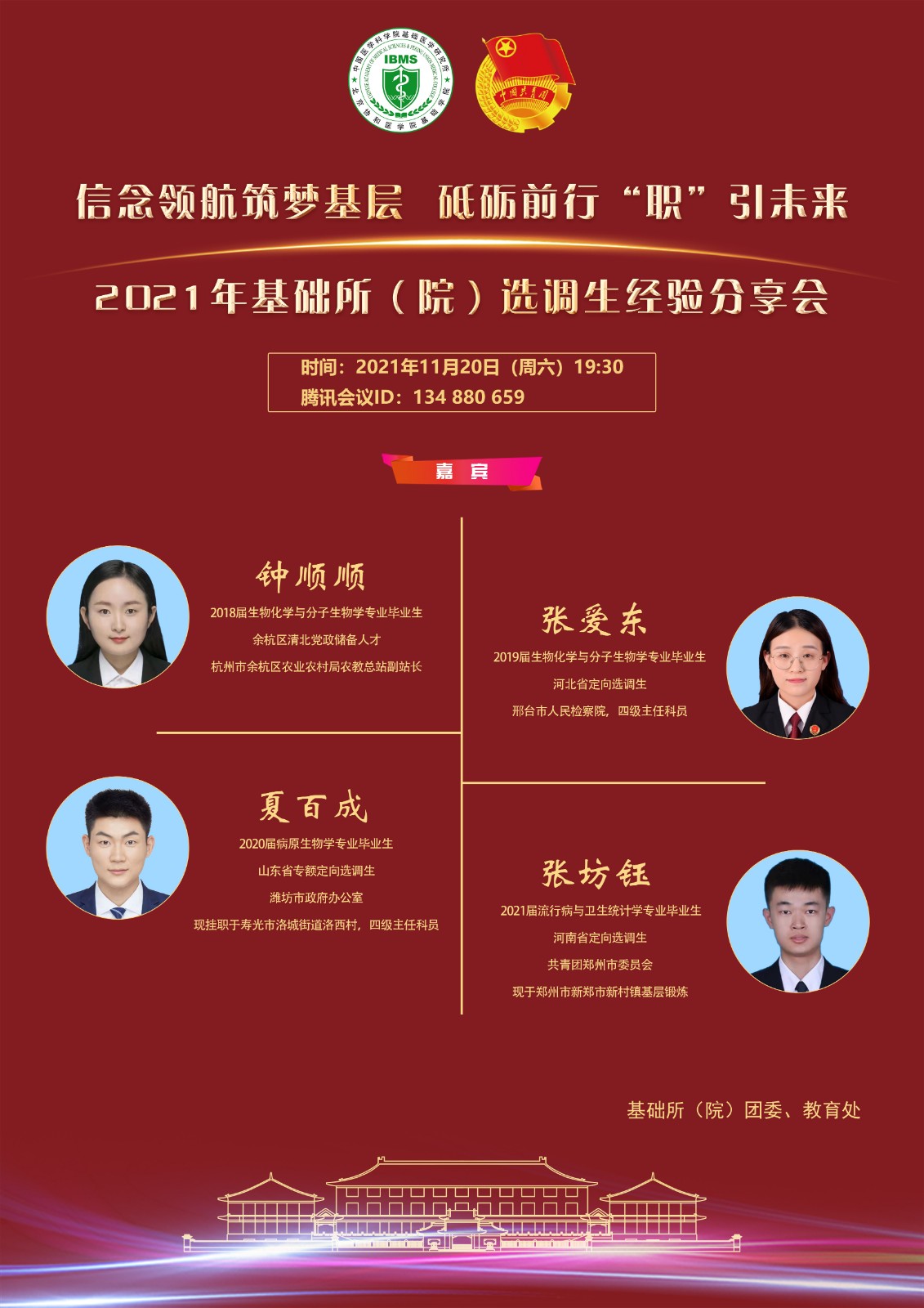 分享會邀請的嘉賓為2018屆生物化學與分子生物學專業畢業生鐘順順,余杭區清北黨政儲備人才,現任杭州市余杭區農業農村局農教總站副站長;2019屆生物化學與分子生物學專業畢業生張愛東,河北省定向選調生,現就職于邢臺市人民檢察院;2020屆病原生物學專業畢業生夏百成,選調到濰坊市政府辦公室,現掛職余壽光市洛城街道洛西村;2021屆流行病與衛生統計學專業畢業生張坊鈺,選調到共青團鄭州市委員會,現掛職于新鄭市新村鎮。他們結合親身經歷,圍繞選調生政策、選調備考、職路歷程、工作感悟生動全面地講述了選調生工作中的體會與收獲,激勵師弟師妹們堅守為人民服務的初心,不斷歷練自我,提升本領,不辱時代使命,扎根人民,奉獻國家。