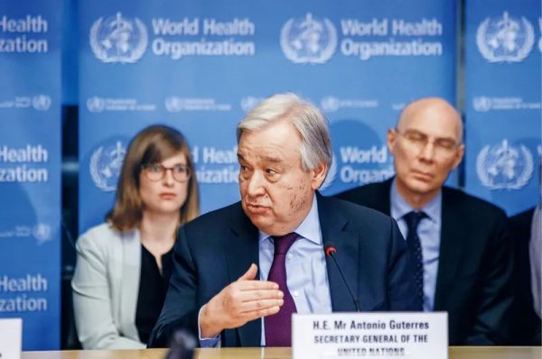 2020年2月24日,聯(lián)合國(guó)秘書(shū)長(zhǎng)古特雷斯(前)在瑞士日內(nèi)瓦世界衛(wèi)生組織總部發(fā)表講話。古特雷斯表示,中國(guó)實(shí)施嚴(yán)格的防控措施,以犧牲正常生活的方式為全人類(lèi)作出了貢獻(xiàn)。古特雷斯當(dāng)日造訪日內(nèi)瓦世衛(wèi)組織總部,并與世衛(wèi)組織各部門(mén)負(fù)責(zé)人舉行座談。新華社發(fā)