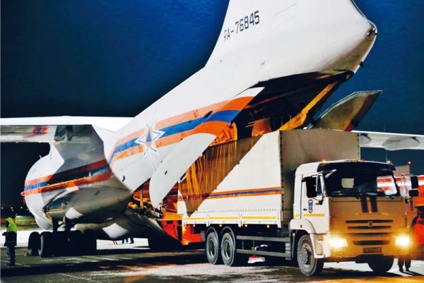 2020年2月8日,在俄羅斯莫斯科附近的茹科夫斯基機(jī)場(chǎng),工作人員將俄羅斯政府向中方提供的醫(yī)療援助物資裝上運(yùn)輸機(jī)。新華社/衛(wèi)星社