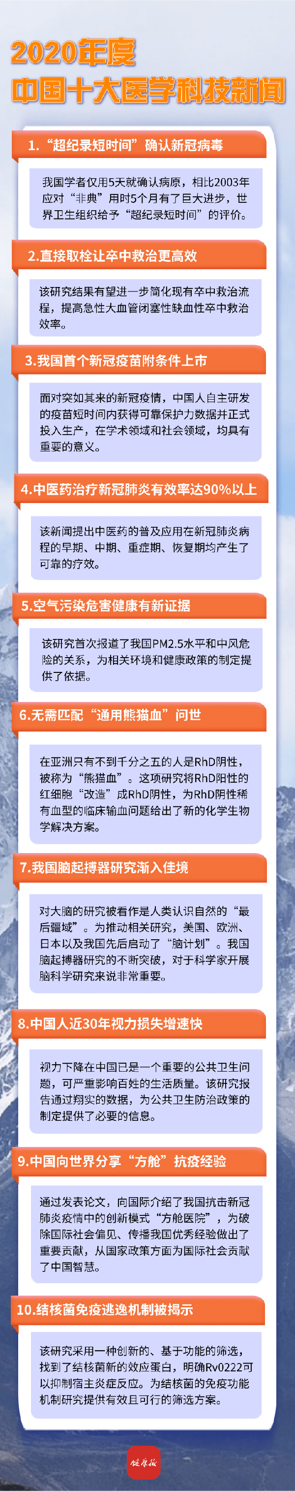 國際醫(yī)學(xué)科技新聞部分,遴選標(biāo)準(zhǔn)是2020年發(fā)表于國際權(quán)威期刊的原創(chuàng)性論文,同時采用PlumX綜合指標(biāo)篩選社交新聞媒體熱度Top100的論文,最后在選出的數(shù)千篇文章中,篩選了排名靠前的47項原創(chuàng)研究成果列入備選條目。
