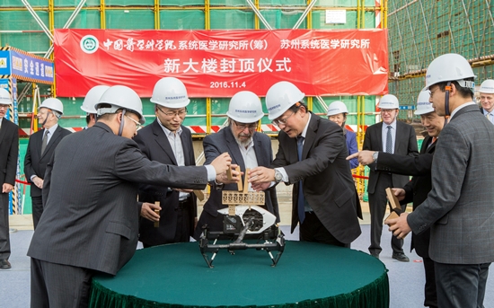 2016年11月4日下午,中國醫學科學院系統醫學研究所(籌)(以下簡稱“系統所”)一期工程主體建筑封頂。中國醫學科學院 北京協和醫學院院校長曹雪濤院士、諾貝爾獎獲得者David Baltimore教授出席見證。參加活動的嘉賓還有美國科學院院士Jeff Miller 教授、美國科學院院士Barry Bloom教授、歐洲科學院院士Guido Kroemer教授等多位國內外專家。
