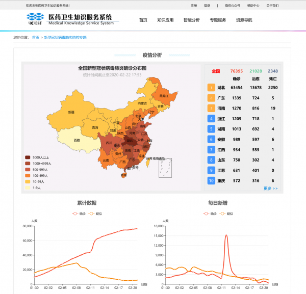 面對新冠肺炎疫情發展的嚴峻形勢,中國工程科技知識中心醫藥衛生分中心團隊基于已有技術積累與建設經驗,快速構建了新型冠狀病毒肺炎防控專題欄目,對當前疫情動態、肺炎防疫指南、定點診治醫院查詢、權威報道、臨床診療資源、醫學文獻、政策法規、公眾關注熱度等多方面的實時數據和權威知識進行采集與整合。專題每天實時更新疫情變化及公眾關注度數據,利用可視化方式進行多維度展示,并依據每日疫情數據變化進行深層次數據解讀與分析,整理撰寫每日疫情快報,為公眾解讀疫情變化后的潛在信息;同時,每天由院士推送團隊整合凝練熱點權威新聞資訊、專家觀點、防控知識以及科研動態等內容,方便用戶快速獲取精煉高價值信息。