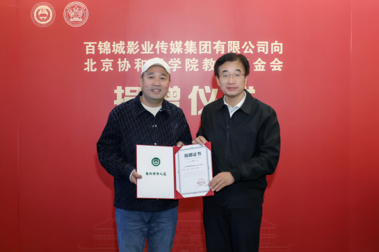 2024年12月5日,百錦城影業傳媒集團有限公司(簡稱“百錦城集團”)向校基金會捐贈儀式在院校九號院舉行,捐贈資金將用于支持院校教育、醫療、科研事業的發展。