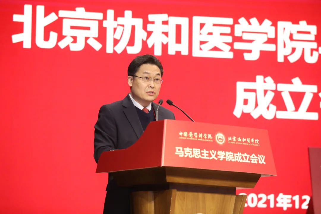 會上,國家衛(wèi)生健康委直屬機(jī)關(guān)黨委常務(wù)副書記楊建立宣讀國家衛(wèi)生健康委黨組書記、主任馬曉偉批示。馬曉偉指出,北京協(xié)和醫(yī)學(xué)院成立馬克思主義學(xué)院是在新時代新征程上全面貫徹習(xí)近平新時代中國特色社會主義思想,落實《關(guān)于加強(qiáng)新時代馬克思主義學(xué)院建設(shè)的意見》的重大舉措。要認(rèn)真學(xué)習(xí)貫徹黨的十九屆六中全會精神,堅持正確辦學(xué)方向,堅持和加強(qiáng)黨的全面領(lǐng)導(dǎo),聚焦馬克思主義中國化時代化最新成果的學(xué)習(xí)研究宣傳,切實發(fā)揮思想政治理論課立德樹人關(guān)鍵課程作用和馬克思主義理論學(xué)科引領(lǐng)作用,大力弘揚(yáng)和傳承百年協(xié)和的優(yōu)秀基因和精神內(nèi)核。