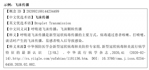 為促進新型冠狀病毒肺炎(COVID-19)相關信息收集、知識匯聚等應用,中國醫學科學院醫學信息研究所收集整理并于2020年2月26日在國家人口健康科學數據中心發布了新型冠狀病毒肺炎術語集(COVID Term)V1.0版本,包括疾病、病毒、癥狀體征、感染人群、疫情防控、心理救助等相關術語的中英文對照、同義關系、相關釋義和來源。在V1.0版本基礎上,本次新增傳播途徑、檢查異常、診療技術和方法、醫用防護用品等內容,更新發布COVID Term V1.1版本,共包含術語1537條,概念442個。COVID Term術語集的發布格式包括CSV、XML 和 JSON。本項研究受中國醫學科學院醫學與健康科技創新工程“中文臨床醫學術語系統構建研究”(2017-I2M-3-014)資助。