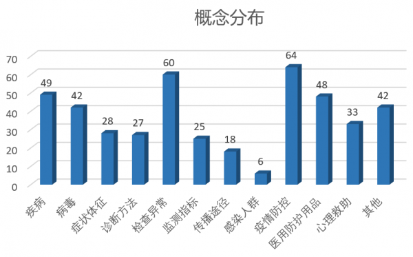 COVID Term以概念為單位對收集、整理的術語進行規范組織。概念表現為一組術語,這些術語間具有相同或相近的意義。圖2是COVID Term V1.1版本中的概念分布。
