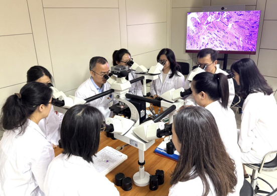 作為國家臨床病理科住培重點(diǎn)基地負(fù)責(zé)人,應(yīng)建明推動(dòng)教學(xué)改革,深入融合病理學(xué)科特色與智慧教學(xué)手段,構(gòu)建起“分層遞進(jìn)、數(shù)字賦能、協(xié)同共享”的教學(xué)體系,實(shí)現(xiàn)從組織到分子、從影像到臨床的全方位融合,顯著提升培養(yǎng)成效。科室為每一位學(xué)員建立電子成長(zhǎng)檔案,實(shí)時(shí)記錄工作量、能力發(fā)展和科研進(jìn)展。