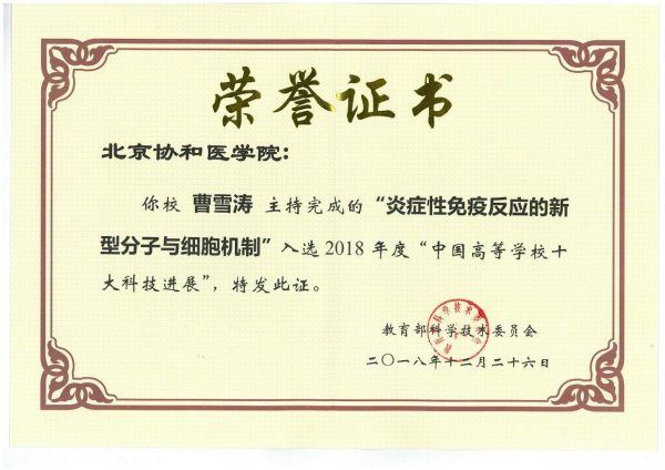 2018年度“中國高等學校十大科技進展”頒獎 曹雪濤院士主持的 “炎癥性免疫反應的新型分子與細胞機制” 項目獲獎