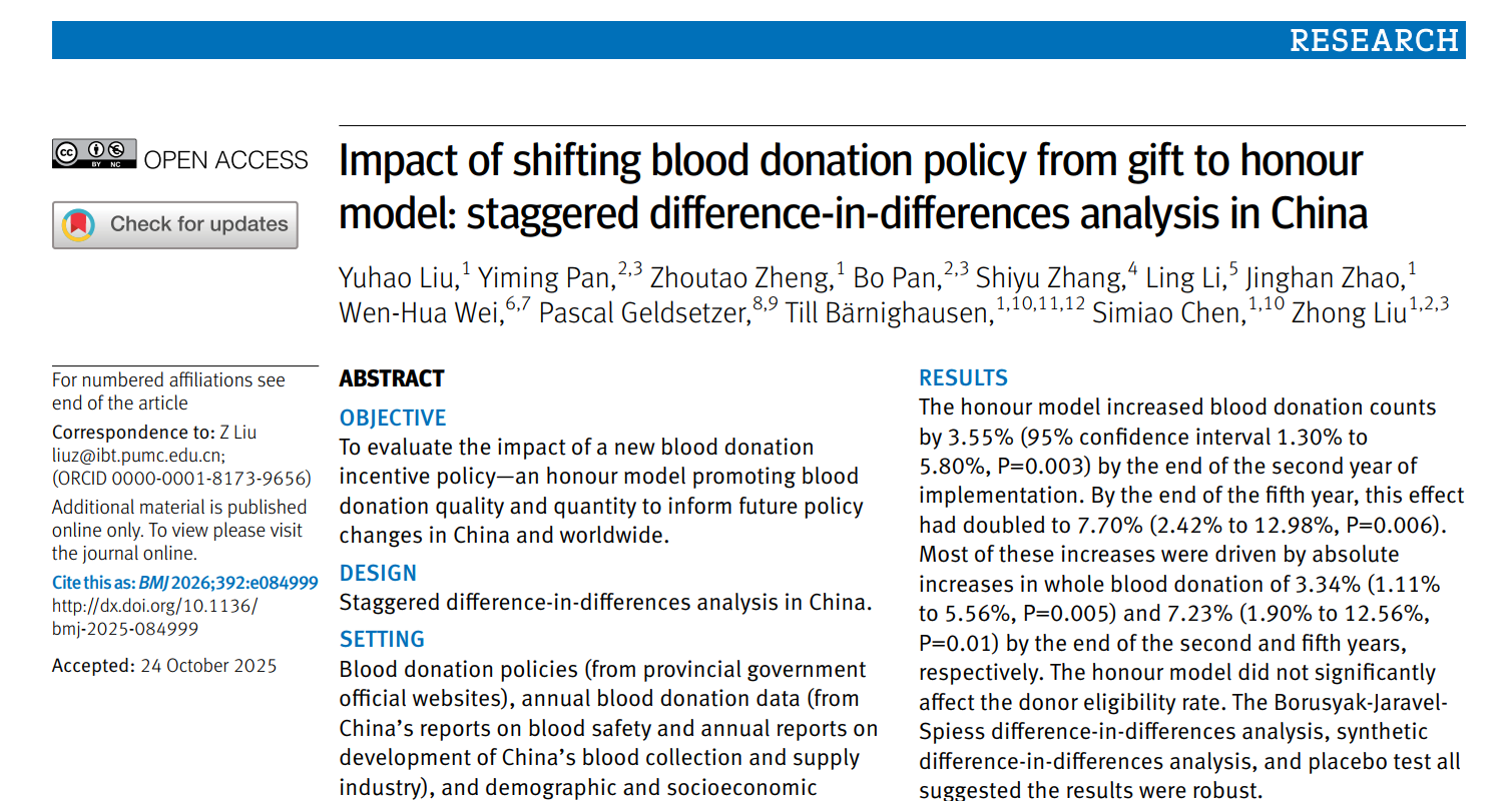 院校劉忠/陳思邈團隊在BMJ 發(fā)文,提出并利用準實驗方法解析無償獻血“榮譽模式”激勵機制